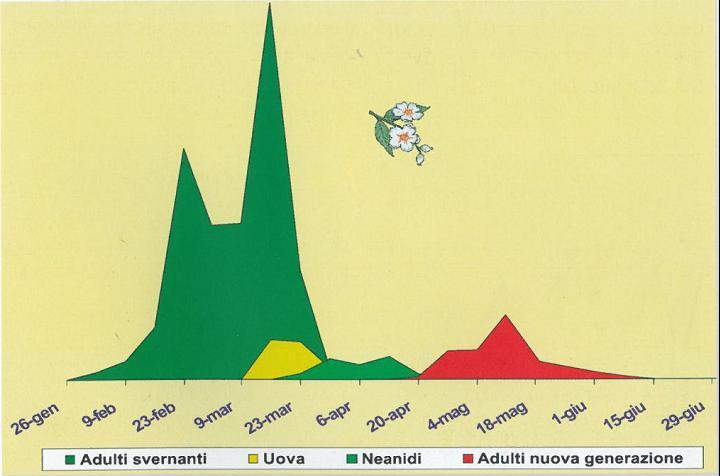 - ricorrere al controllo degli insetti vettori attraverso una difesa attiva: è necessario studiare e tenere sotto controllo il ciclo biologico della psilla per sapere quando è il momento per intervenire; di seguito è riportato il ciclo biologico della Cacopsylla melanoneura e C. picta: